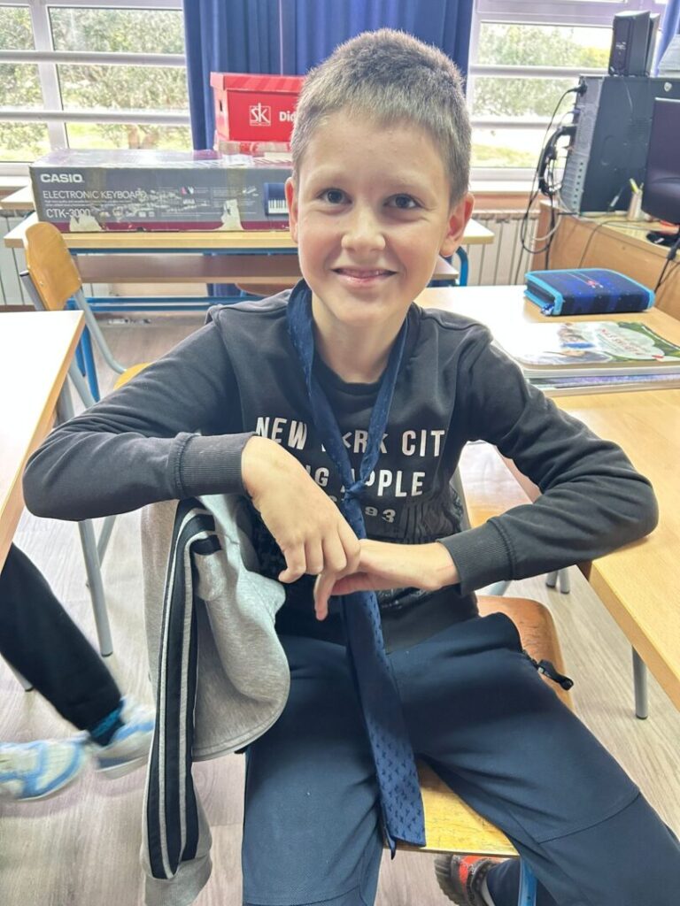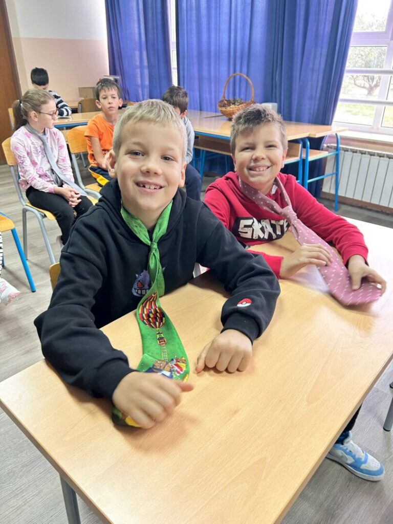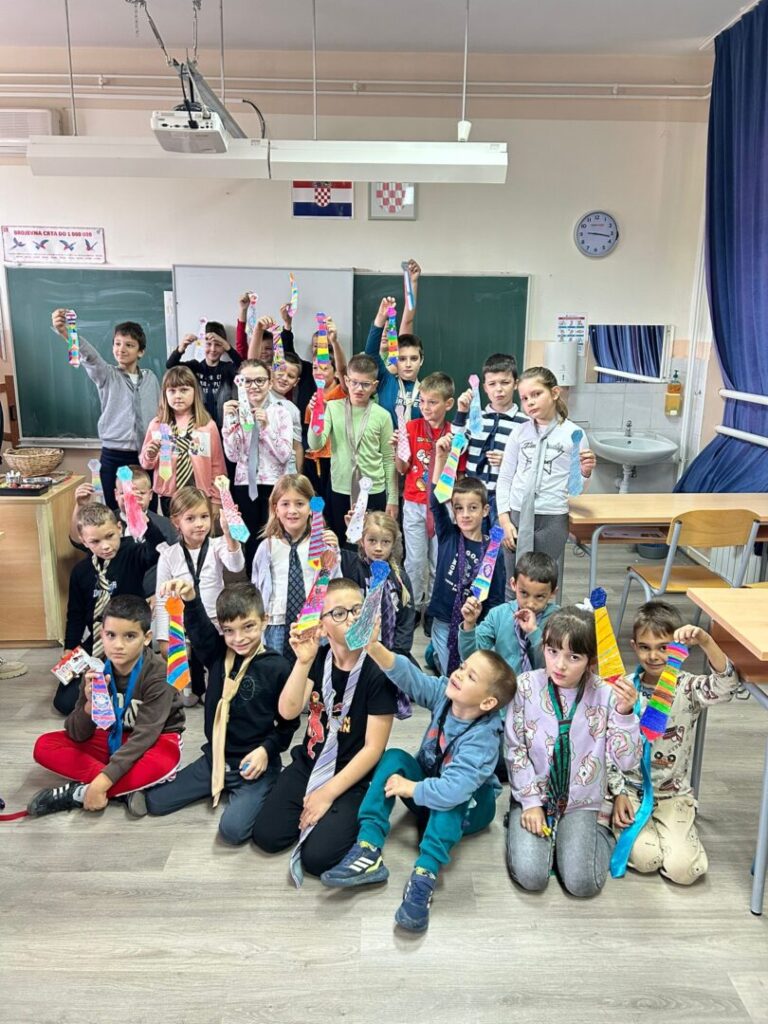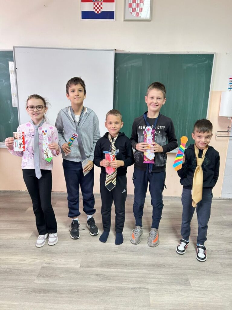 Kao i svake, i ove godine smo obilježili dan kravate tako što su učenici nižih razreda kreirali svoje kravate koristeći papir, škare, bojice i flomastere. Bili su jako kreativni i pritom se dobro zabavili. Skupili smo sve kravate na jedno mjesto i naš žiri (pedagoginja, knjižničarka i učiteljica vjeronauka) je odabrao pet najboljih i ti učenici su dobili nagrade.