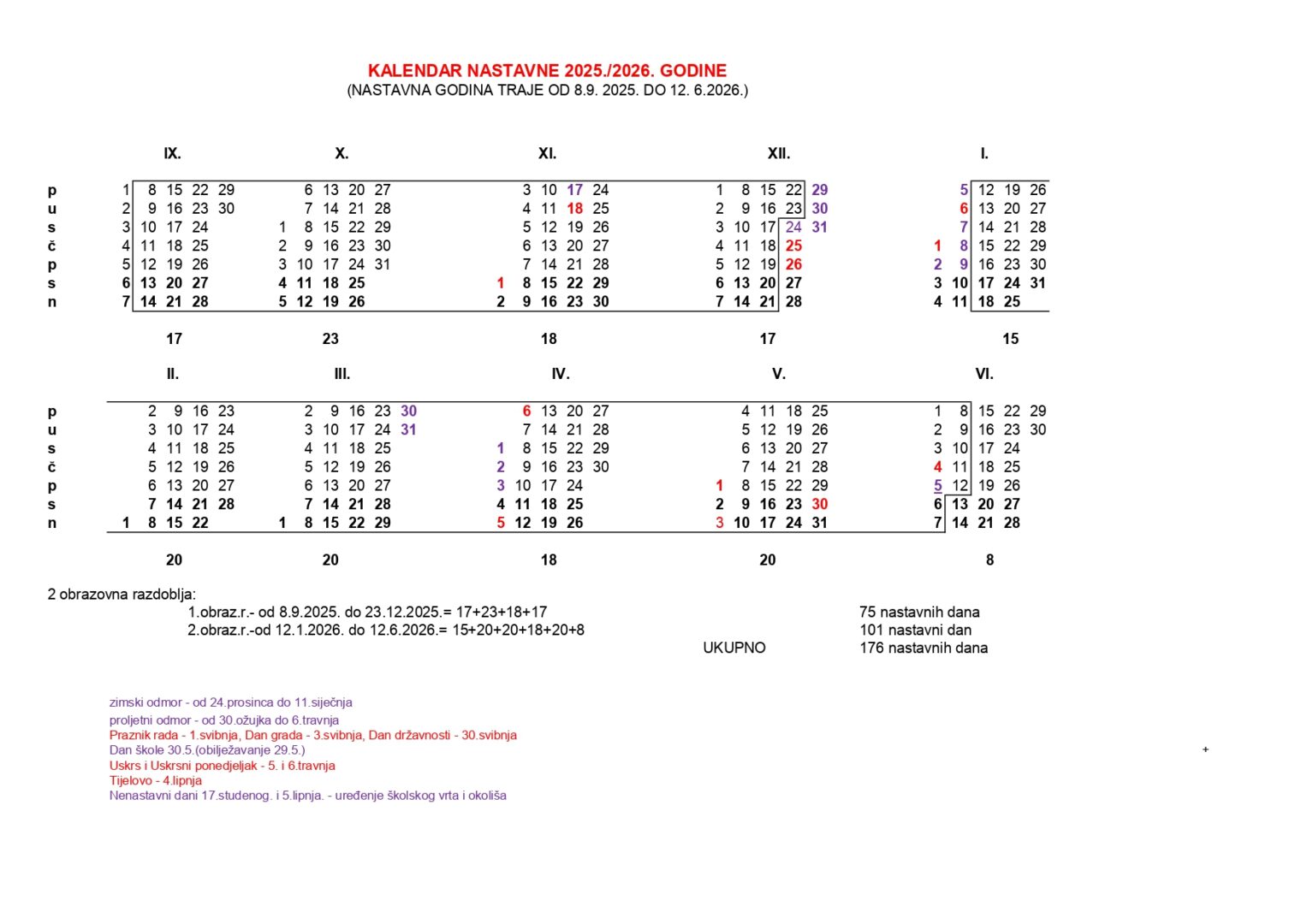 Nastava u školskoj godini 2024./2025. započinje 9. rujna 2024., a završava 13. lipnja 2025. godine, odnosno 23. svibnja 2025. za maturante. Dva su polugodišta – prvo koje će trajati od 9. rujna do 20. prosinca 2024. i drugo koje traje od 7. siječnja do 13. lipnja 2025. godine, odnosno do 23. svibnja za maturante.