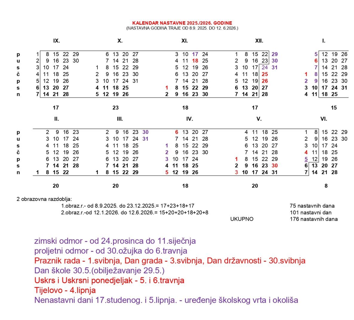 - proljetni praznici počinju 17. travnja 2025. godine i završavaju 21. travnja 2025. godine, s tim da nastava počinje 22. travnja 2025. godine